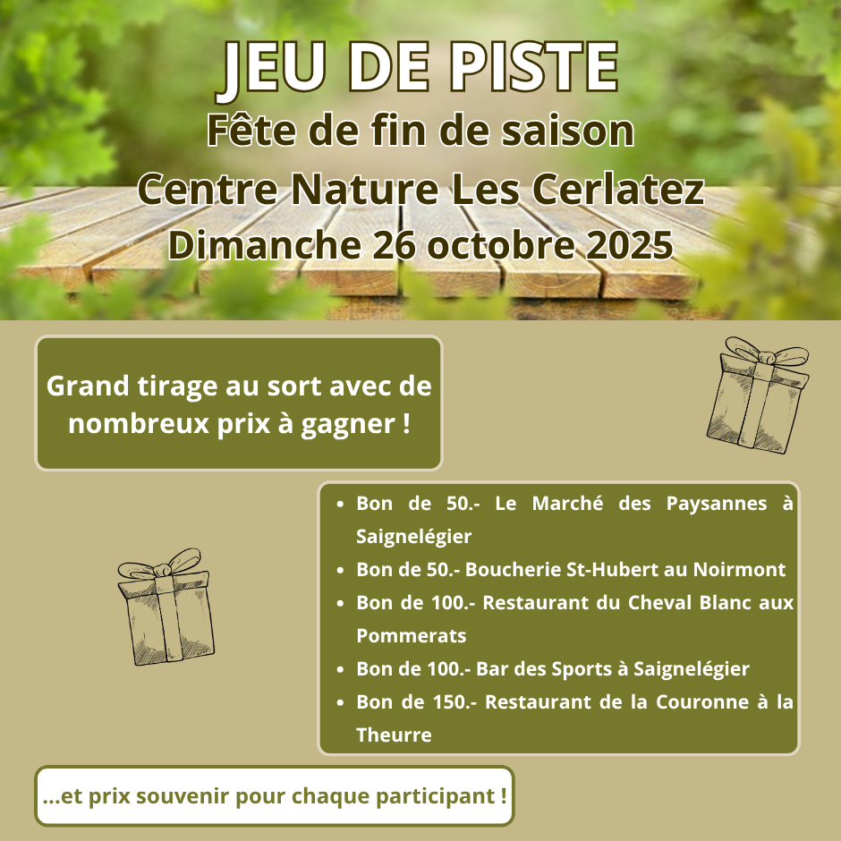 - 11h-16h Jeu de piste (tous âges, 3,2 km de marche) – au départ du Centre Nature Les Cerlatez - bonnes chaussures conseillées
